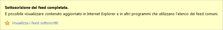 In questa schermata è possibile modificare il nome del Feed, inserirlo in una cartella, o aggiungerlo alla barra dei Preferiti. Una volta completata la selezione, fare click su "Sottoscrivi"; a questo punto verrà visualizzato il seguente messaggio: