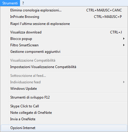 Per potere aggiornare più spesso i feed è necessario modificare una opzioni di Internet Explorer per il controllo automatico degli aggiornamenti. Dal menù "Strumenti" di Internet Explorer selezionare "Opzioni Internet".